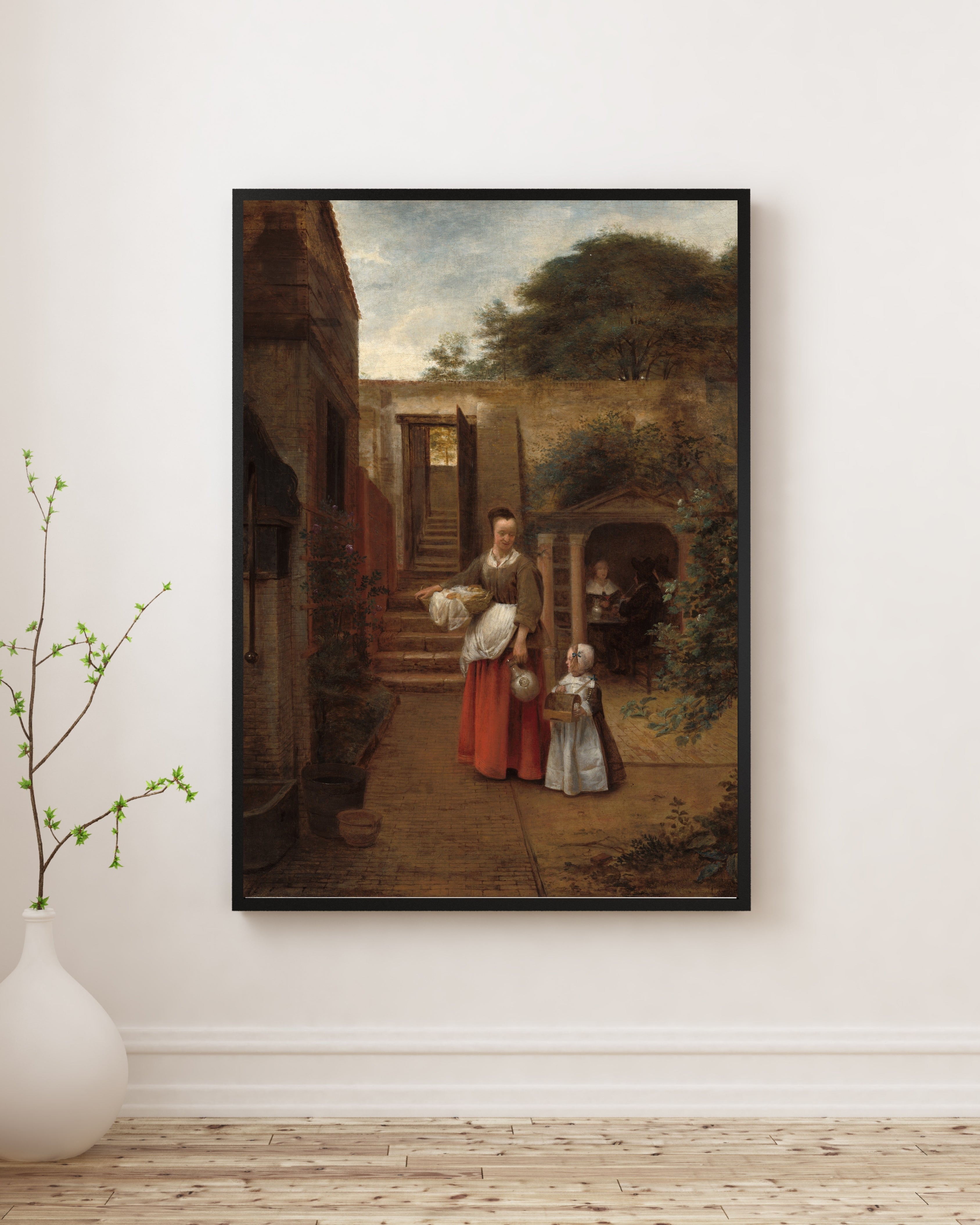 “Woman and Child in a Courtyard”, hem aile içinde paylaşılan sessiz bir anı hem de Hollanda ev mimarisinin sıcak atmosferini yansıtan, De Hooch’un olgun ustalığının seçkin bir örneğidir.