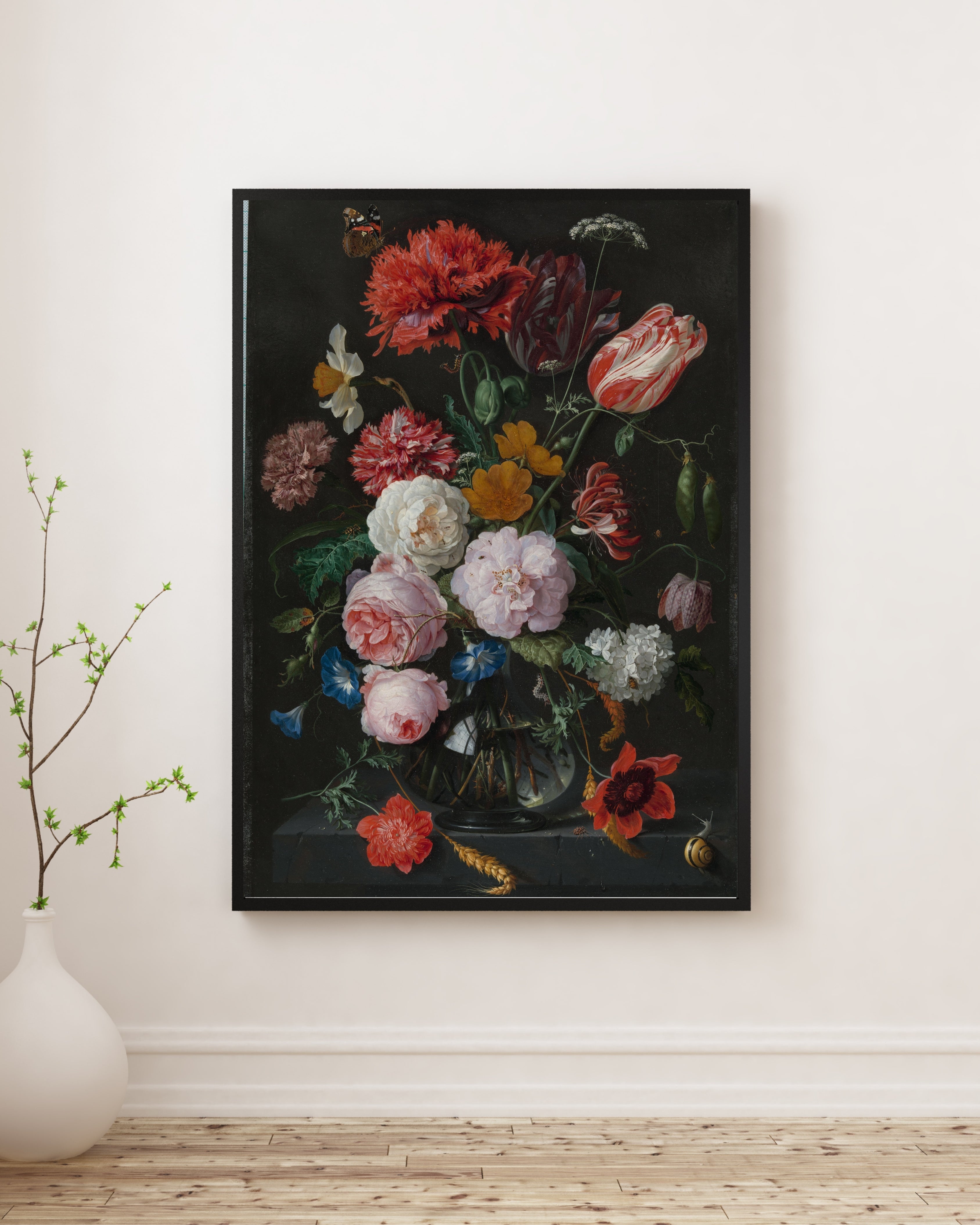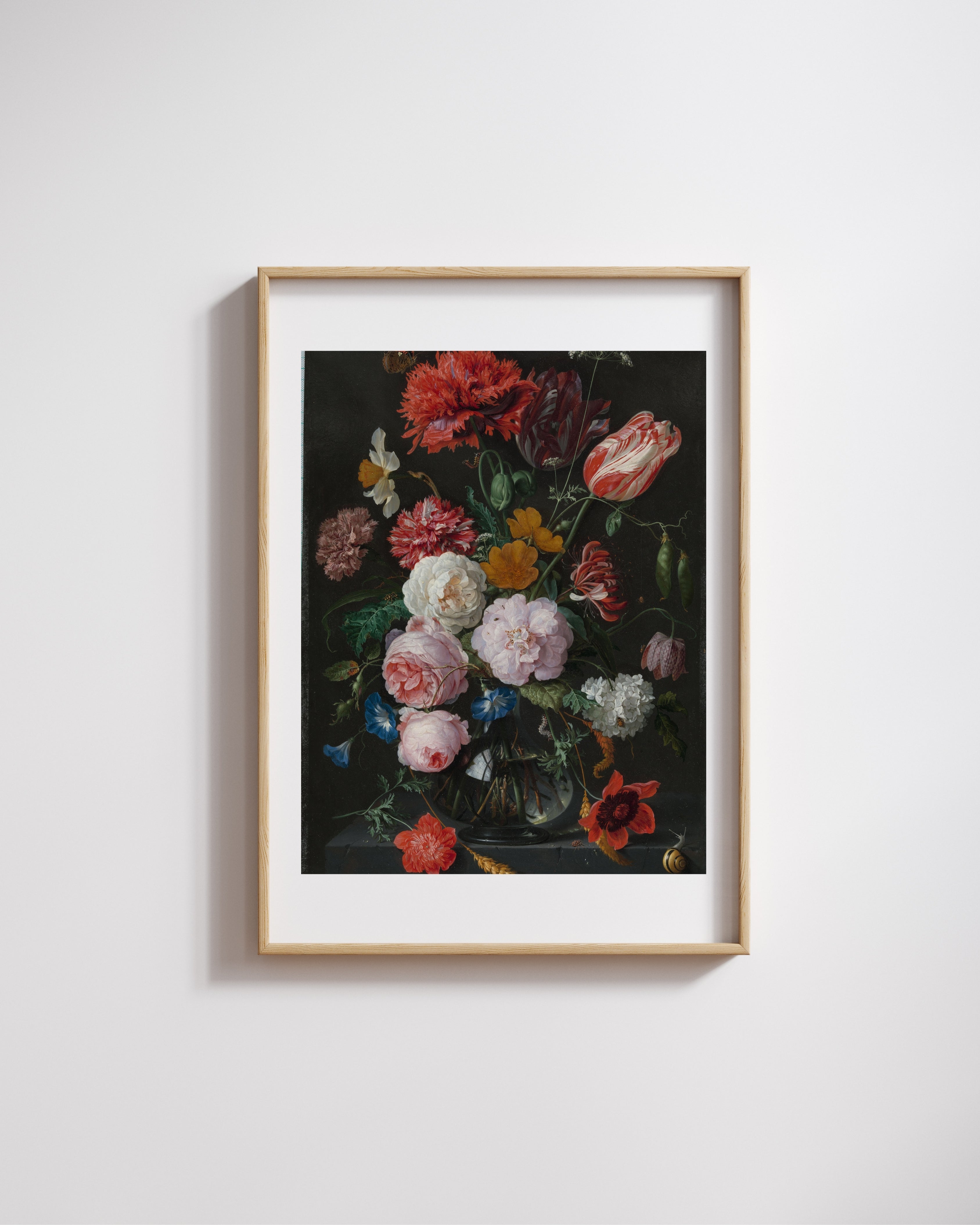 Jan Davidsz. de Heem (1606–1684), Hollanda Baroku’nun en büyük natürmort ustalarındandır. Zenginlik, doğa, zaman ve fanilik temalarını olağanüstü bir teknik ustalıkla birleştirerek, natürmort türünü hem sembolik hem görsel bir zirveye taşımıştır. “Still Life with Flowers in a Glass Vase”, de Heem’in yüksek Barok natürmort anlayışını tüm inceliğiyle ortaya koyan, detayları, ışık oyunları ve renk armonisiyle göz kamaştıran bir başyapıttır.