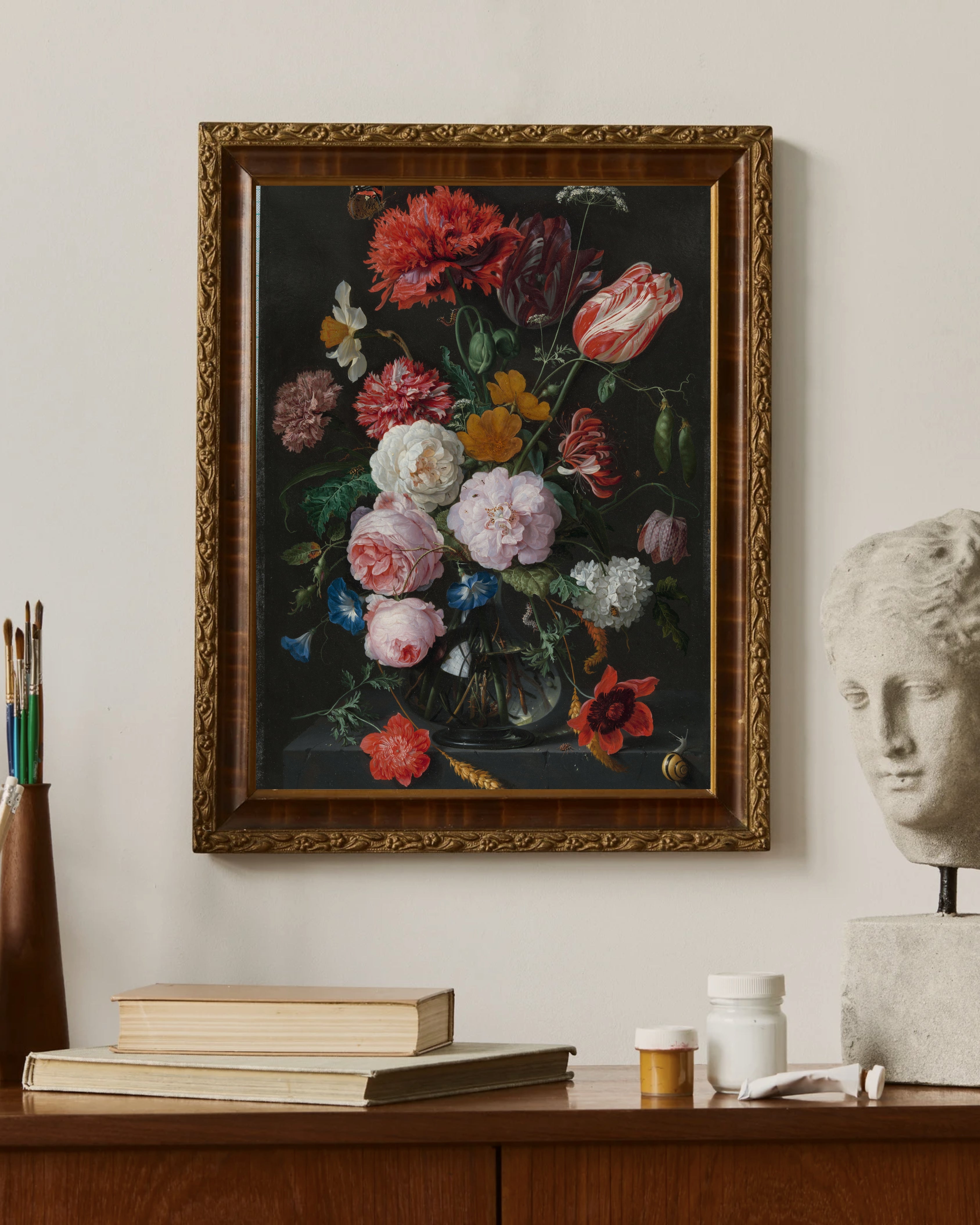 Bu kompozisyonda, cam bir vazonun içinde farklı mevsimlere ait çiçekler birleşir—lale, gül, süsen, gelincik, sümbül ve daha pek çok tür. Bu seçki, hem botanik zenginliği hem de mevsimlerin geçiciliğini tek bir bukette toplar. De Heem, çiçek taç yapraklarının ince saydamlığını, gölgelerin kadifemsi ağırlığını ve camın kıymetli parlaklığını neredeyse dokunulacak kadar gerçekçi bir ustalıkla betimler. Kompozisyonun dengesi özenle kurulmuştur: çiçeklerin yukarı doğru genişleyen hareketi, aşağıya doğru sarkan yapraklar ve zarifçe yerleştirilmiş böcekler sahneye doğal bir canlılık katar. Karanlık fon, çiçeklerin parlaklığını öne çıkarırken, ışığın çiçek yüzeyindeki narin titreşimi tabloya dramatik ama sakin bir derinlik verir.
