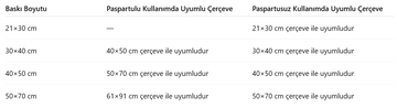 Aşağıdaki tablo, baskı boyutunuza uygun çerçeve ölçüsünü seçmenize yardımcı olur.