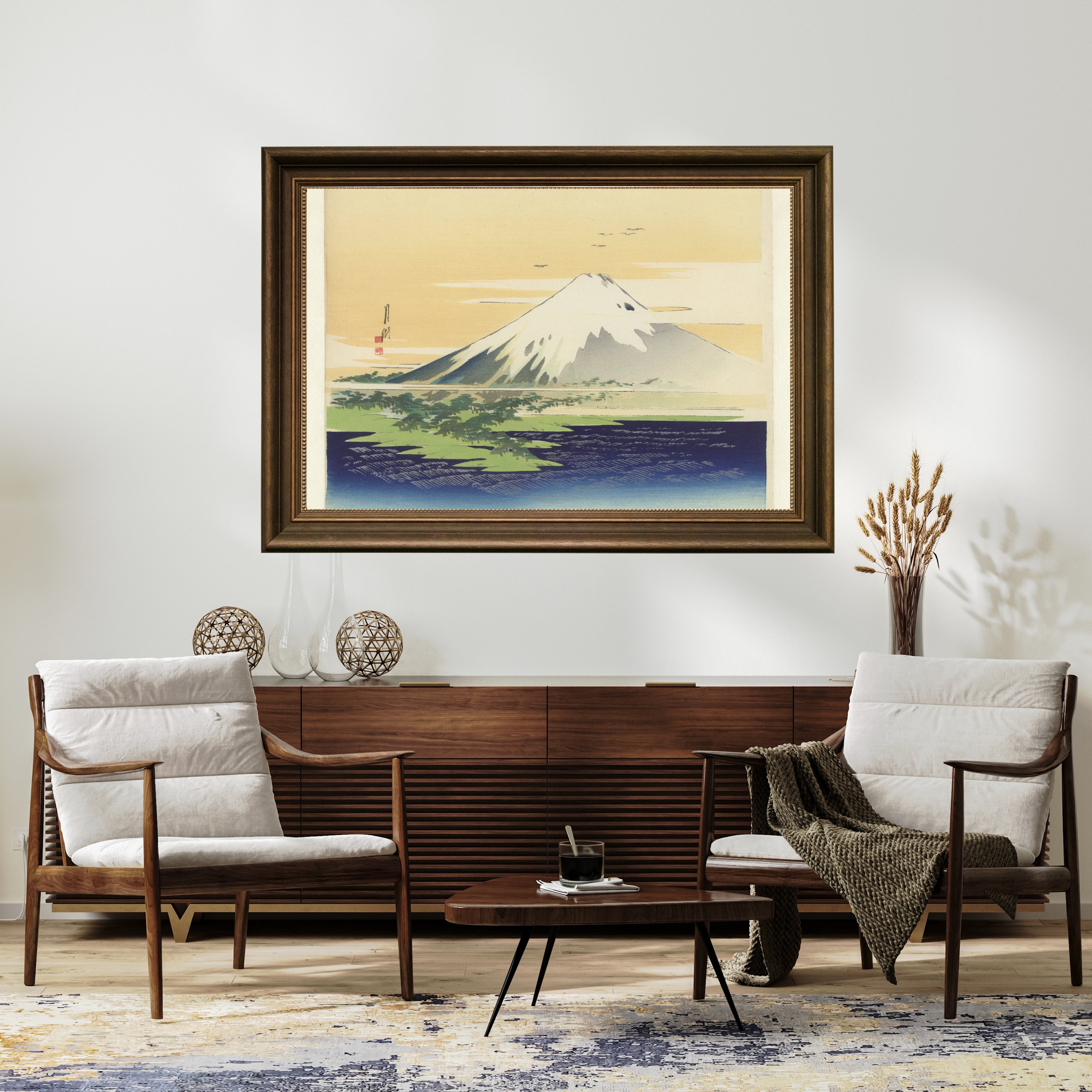Kompozisyonda Fuji Dağı, sahnenin merkezinde ya da baskın bir odak noktası olarak yükselir. Çevresel unsurlar — bulutlar, sis ya da ön plandaki küçük figürler — dağın ölçüsünü ve sürekliliğini vurgulamak için bilinçli olarak geri planda tutulur. Gekkō’nun yumuşak renk geçişleri ve kontrollü çizgileri, manzaraya sakin ve şiirsel bir atmosfer kazandırır. Fuji, burada yalnızca coğrafi bir oluşum değil; süreklilik, denge ve doğayla uyumun simgesi hâline gelir.