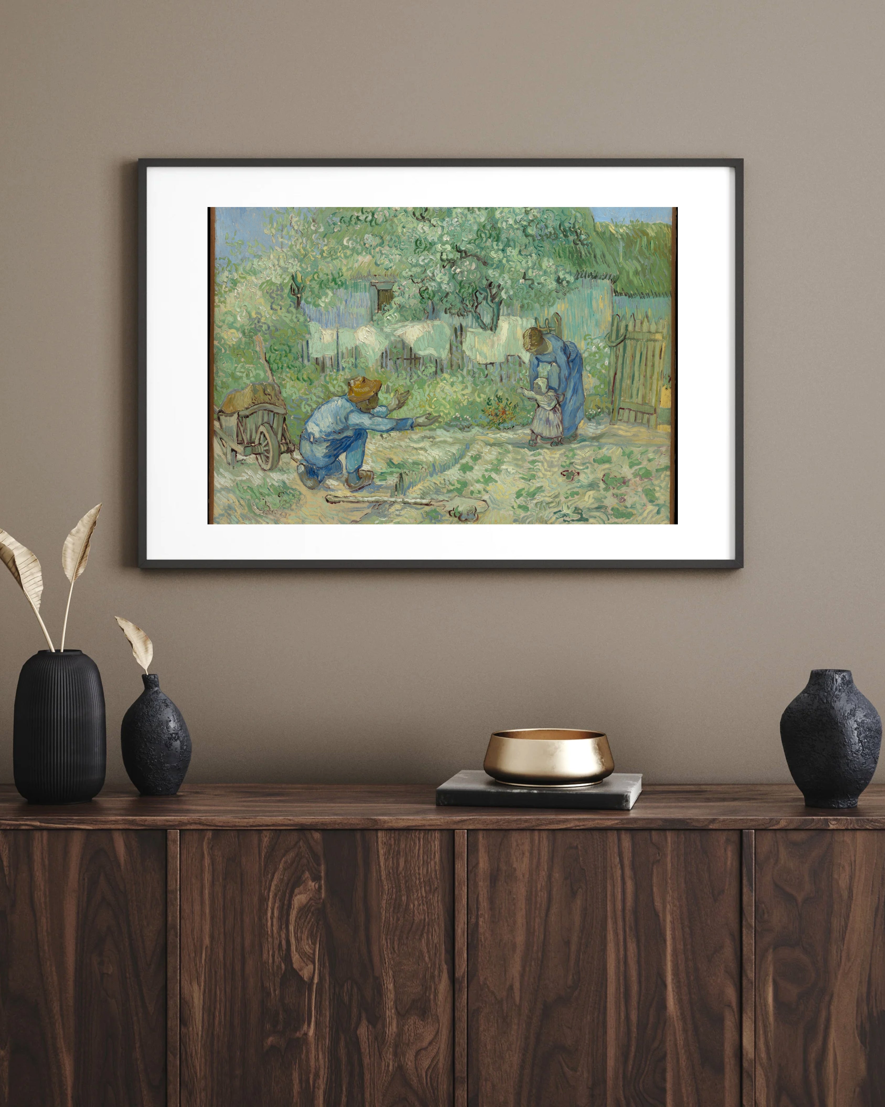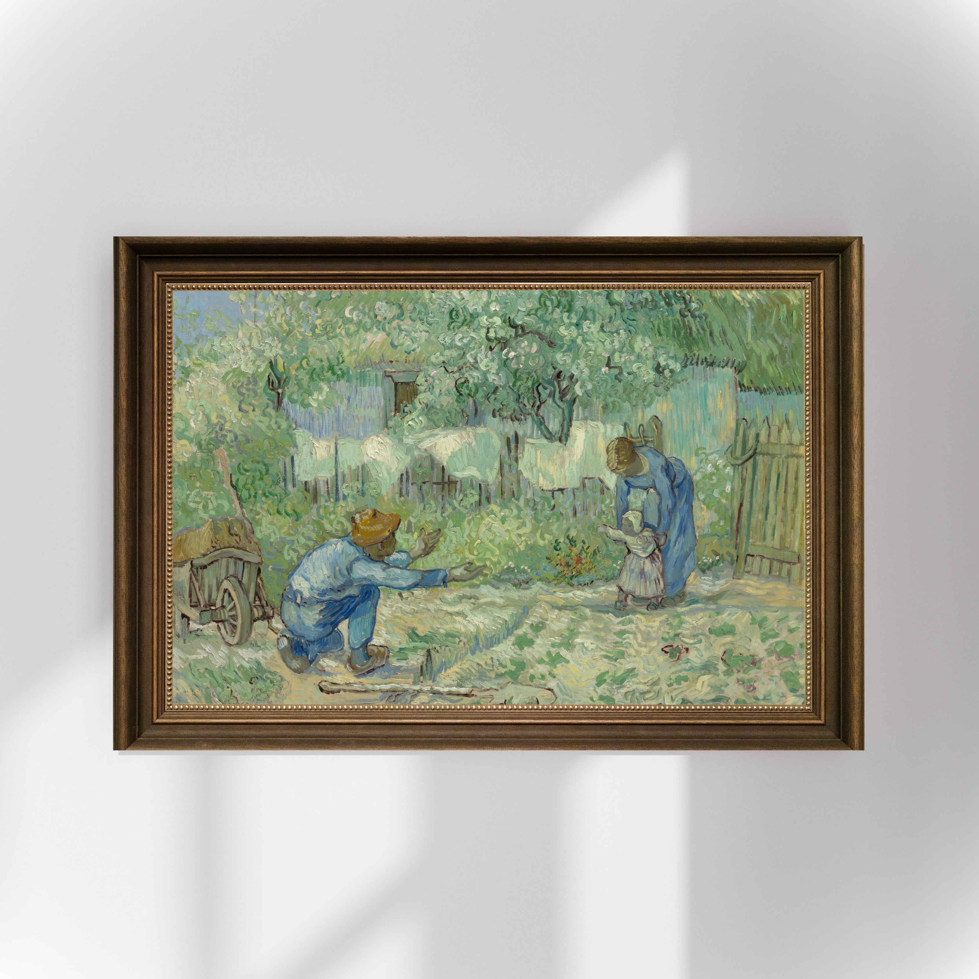Sahnede, bir anne, çocuğuna ilk adımlarını atarken rehberlik eder; baba, tarladan dönmüş hâlde, kollarını açmış, çocuğu karşılamaktadır. Arka planda tarla, bahçe çiti ve ev görülür. Van Gogh bu temada aile sevgisini, emeği ve doğanın içindeki insani sıcaklığı yüceltir.