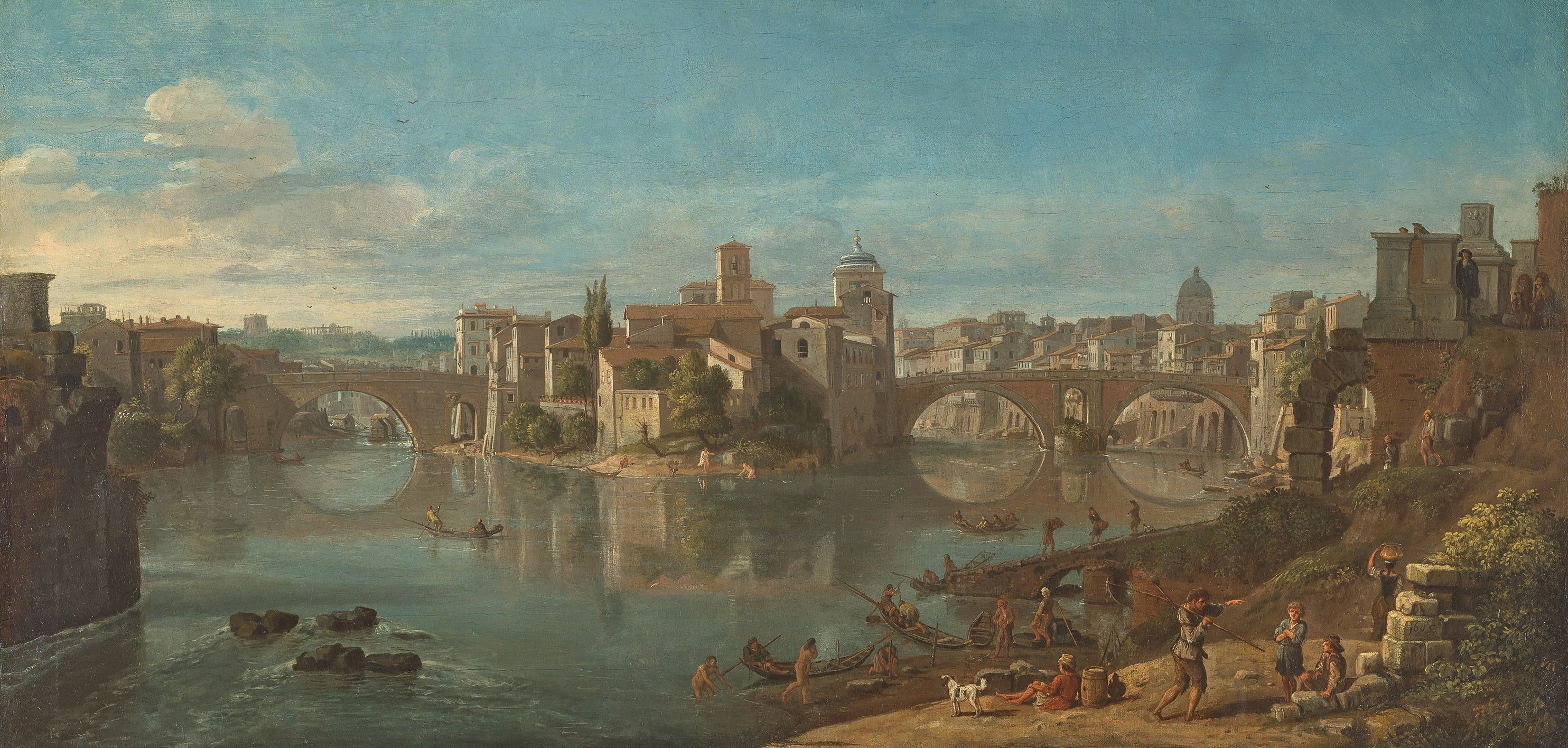 Vanvitelli bu eserinde yalnızca bir kentsel görünüm sunmakla kalmaz; doğa, tarih ve insan yaşamını tek bir armoni içinde birleştirir. Gerçekçi ayrıntılarla işlenmiş tekneler, köprü üzerindeki figürler ve taş yapıların sıcak tonları, izleyiciyi Roma’nın tarihsel sürekliliğini hissetmeye davet eder.