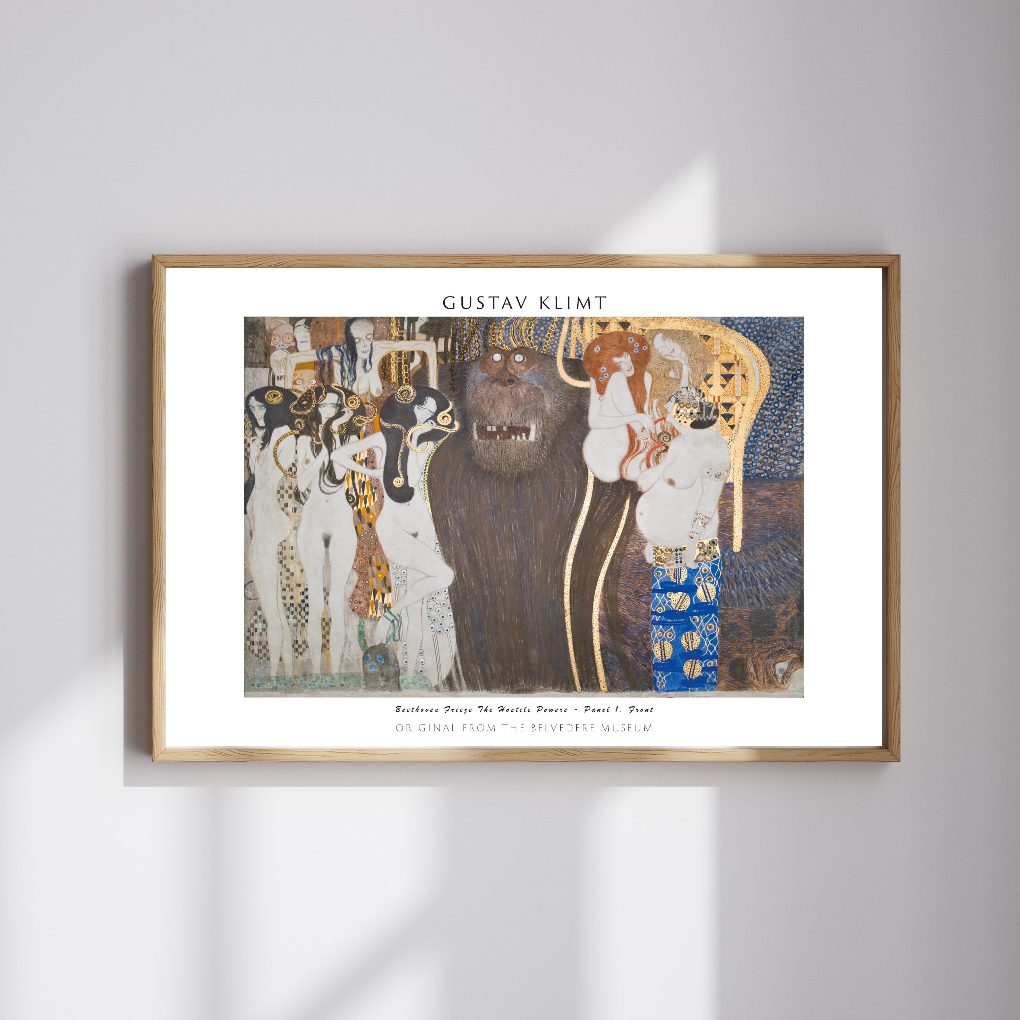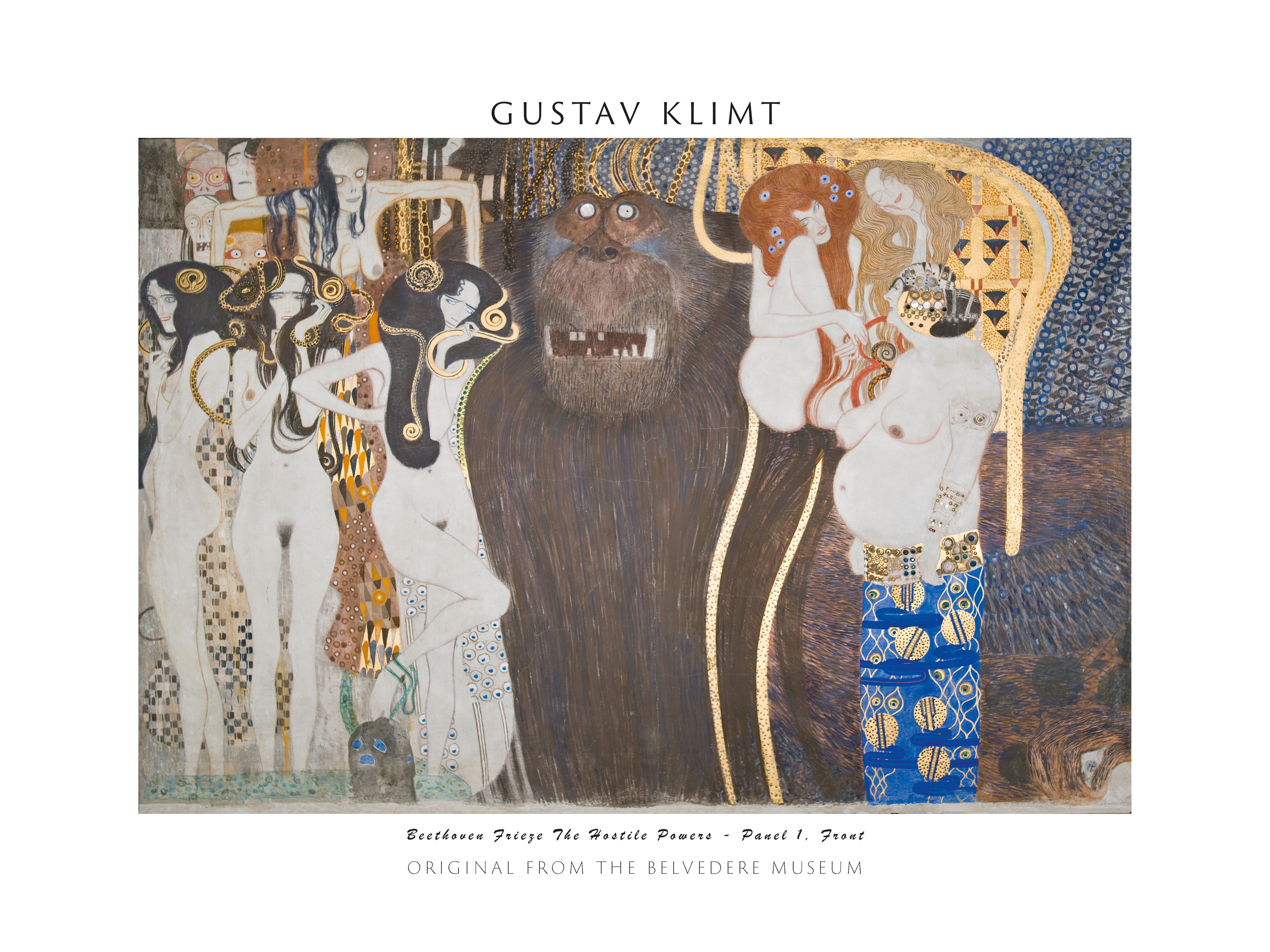 “Beethoven Frizi: Düşman Güçler – Panel 1, Ön Duvar / Beethoven Frieze: The Hostile Powers – Panel 1, Front Wall (Beethovenfries: Feindliche Mächte – Tafel 1, Vorderwand) eseri, Klimt’in 1902 yılında Viyana Secession binasında düzenlenen XIV. Secession Sergisi için oluşturduğu ünlü Beethoven Frieze dizisinin bir bölümüdür. Bu devasa duvar resmi, Beethoven’ın 9. Senfonisi’nin “İnsanın mutluluğa ulaşma mücadelesi” temasını görselleştirir.