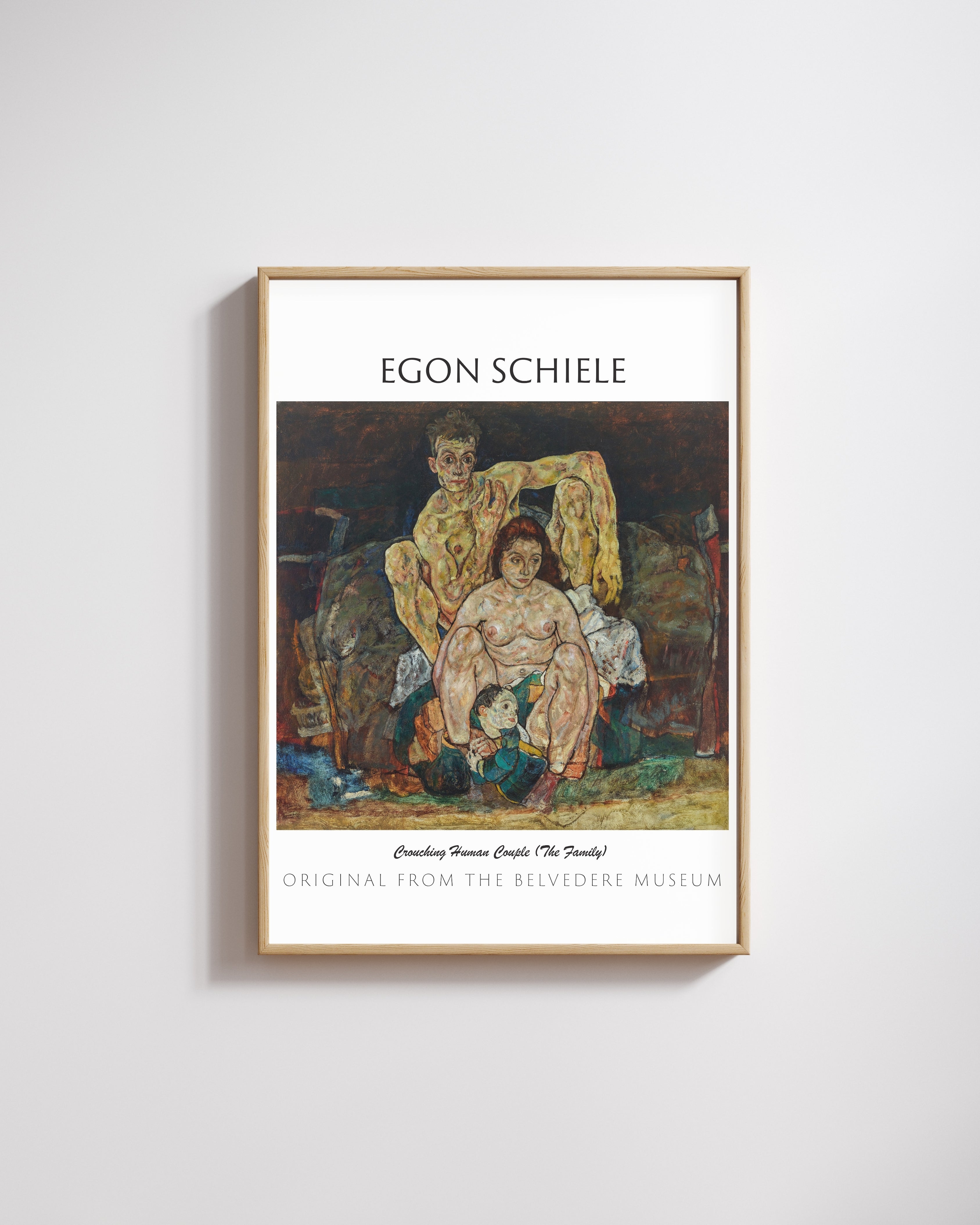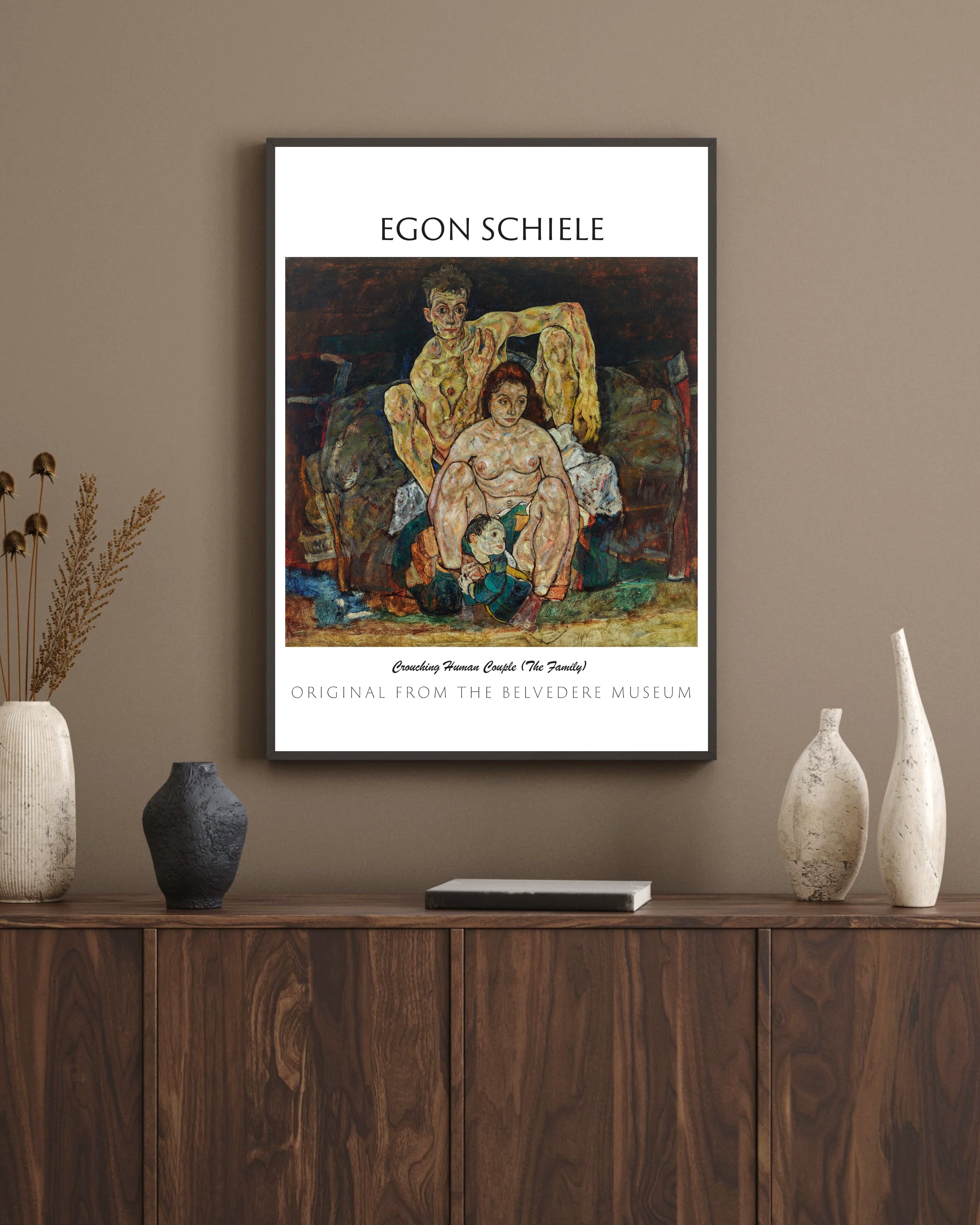 Sanatçının 1918 tarihli Çömelmiş İnsan Çifti (Aile) Crouching Human Couple (The Family / Sitzendes Menschenpaar) adlı eseri, hem kişisel hem sanatsal olarak büyük bir sembolik anlam taşır. Eser, Schiele’nin yaşamının son yılında, eşi Edith Harms hamileyken yapılmıştır. Tabloda bir erkek, bir kadın ve bir çocuk figürü yer alır — ancak çocuk figürü tamamlanmamıştır; bu durum, sanatçının henüz doğmamış çocuğuna bir gönderme olarak yorumlanır.
