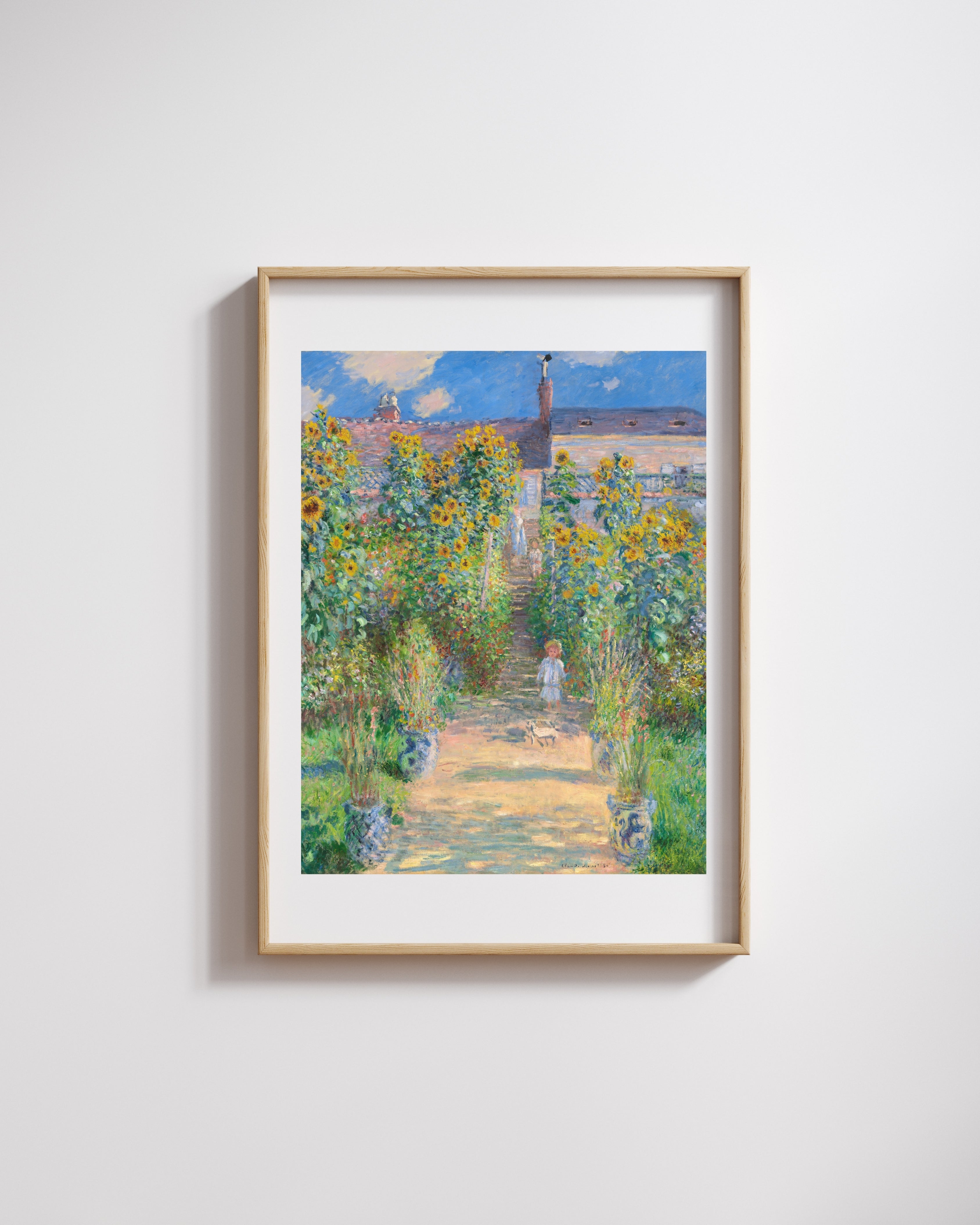 In this composition, Monet, viewing the garden from a slightly oblique angle, renders the field-like abundance of flowers with vibrations of yellow, pink, and blue. The flowerbeds scattered along both sides of the path lend the painting both a sense of depth and rhythmic movement. The house, visible in the distance, creates a serene focal point within the sea of flowers. The brushstrokes are short and pulsating; the garden becomes not just a space but a vibrant atmosphere touched by light. Here, Monet focuses not on detail, but on the play of sunlight on the flowers.