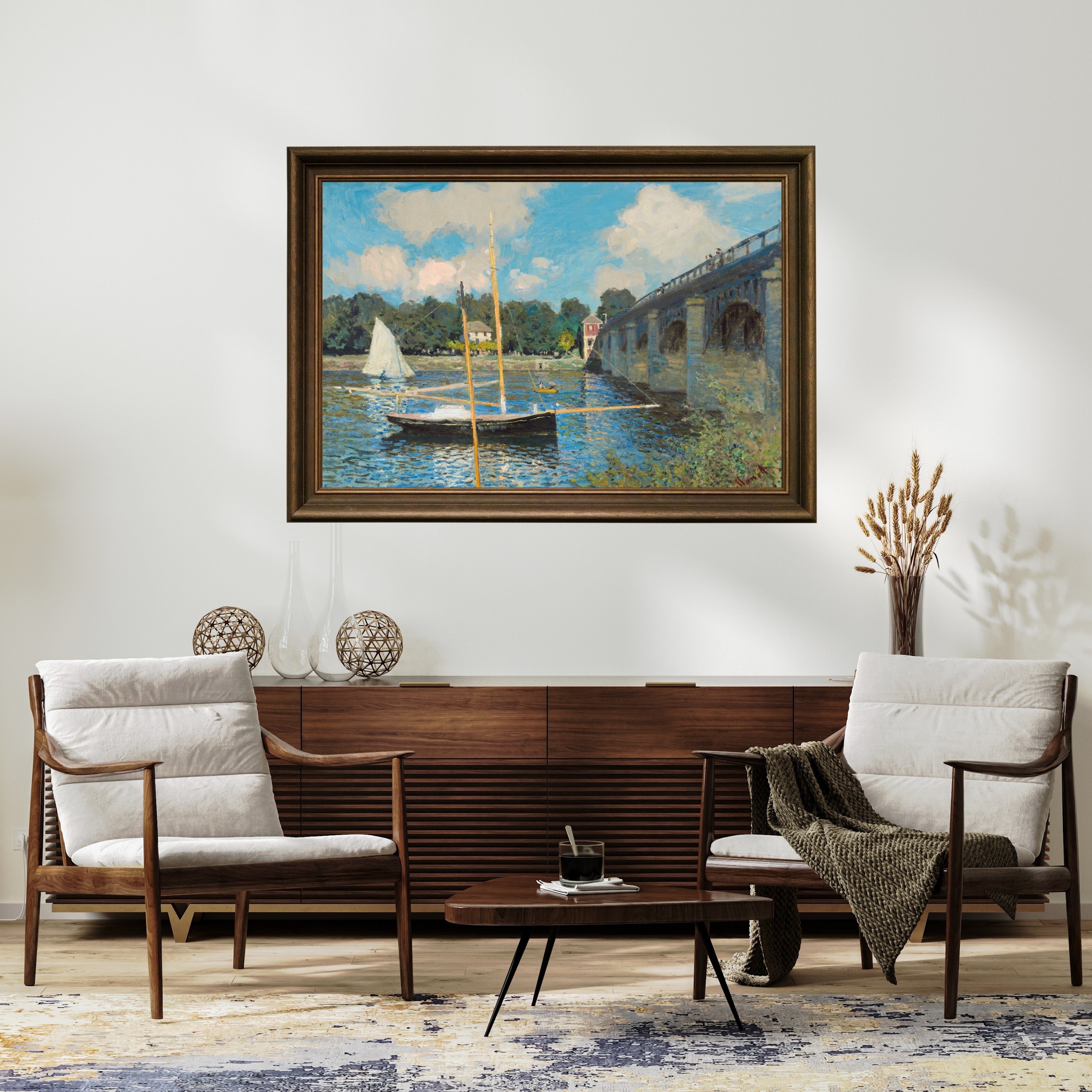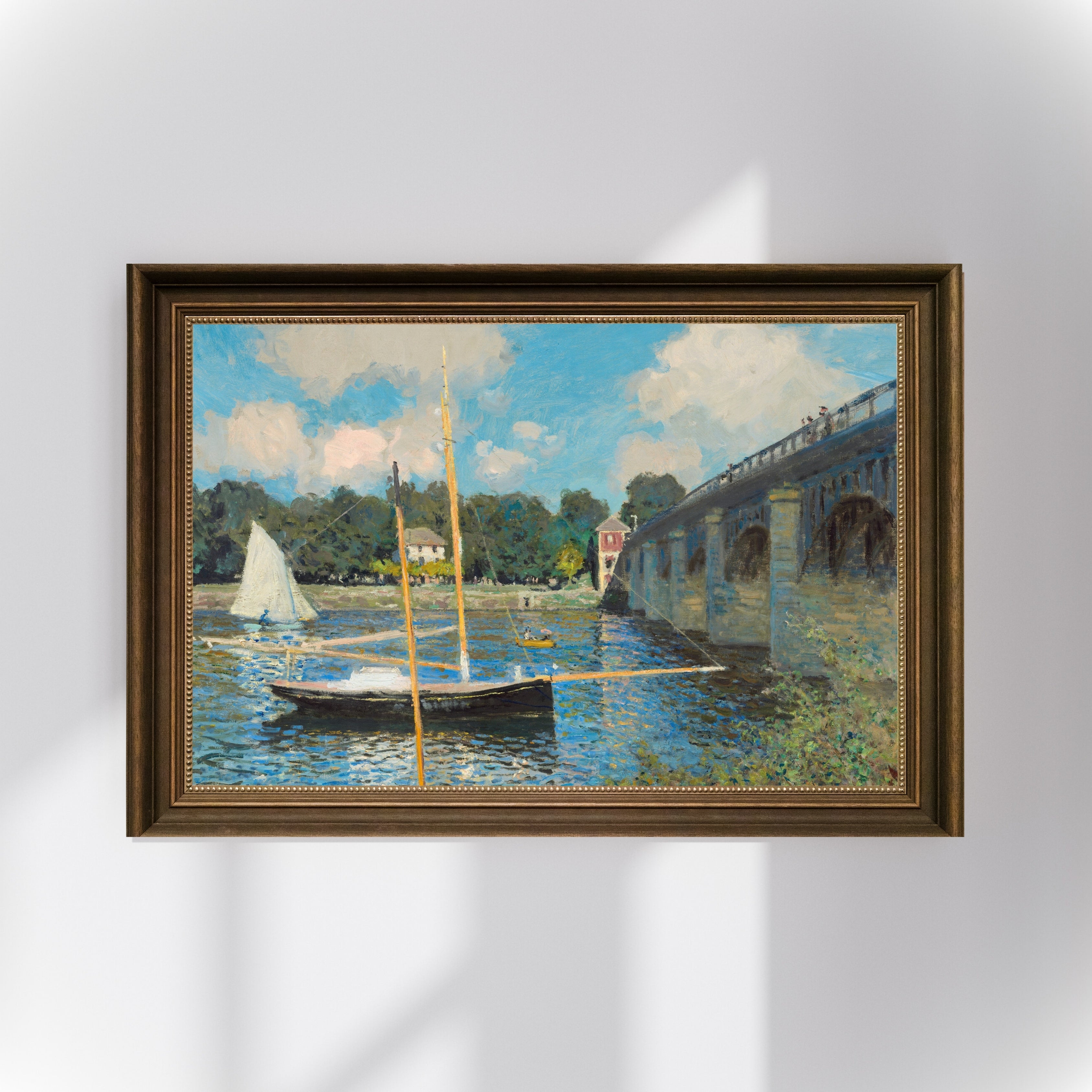 During his Argenteuil period (1872–1878), Claude Monet (1840–1926) painted the changing effects of light on water, the energy of modern coastal life, and the pastoral freshness of the Seine River in the most brilliant Impressionist terms. "The Bridge at Argenteuil" is one of the most characteristic and beloved examples of Monet's visual explorations from this period. Argenteuil became for the young Monet both a living space and a "workshop of nature" where the light was constantly changing.