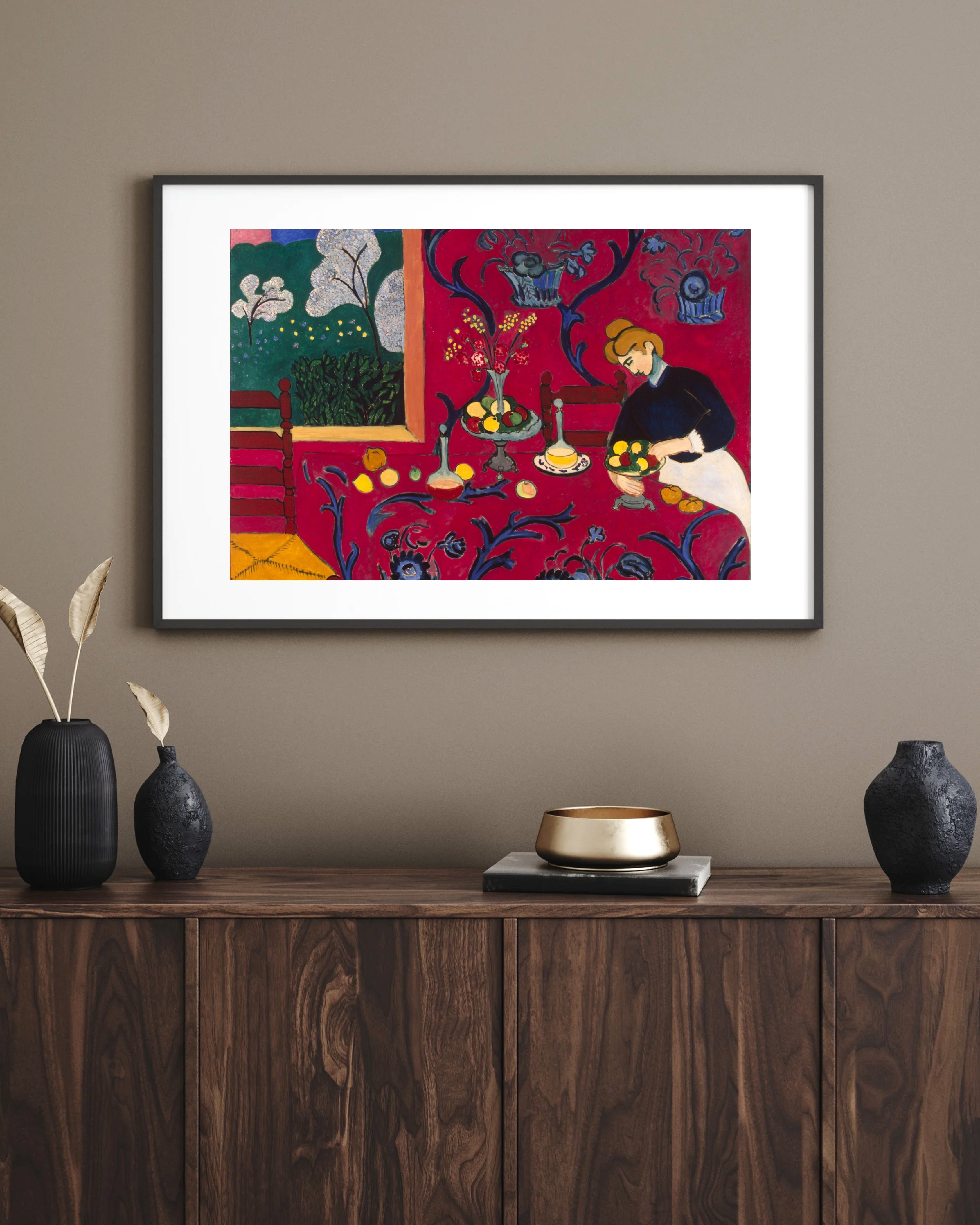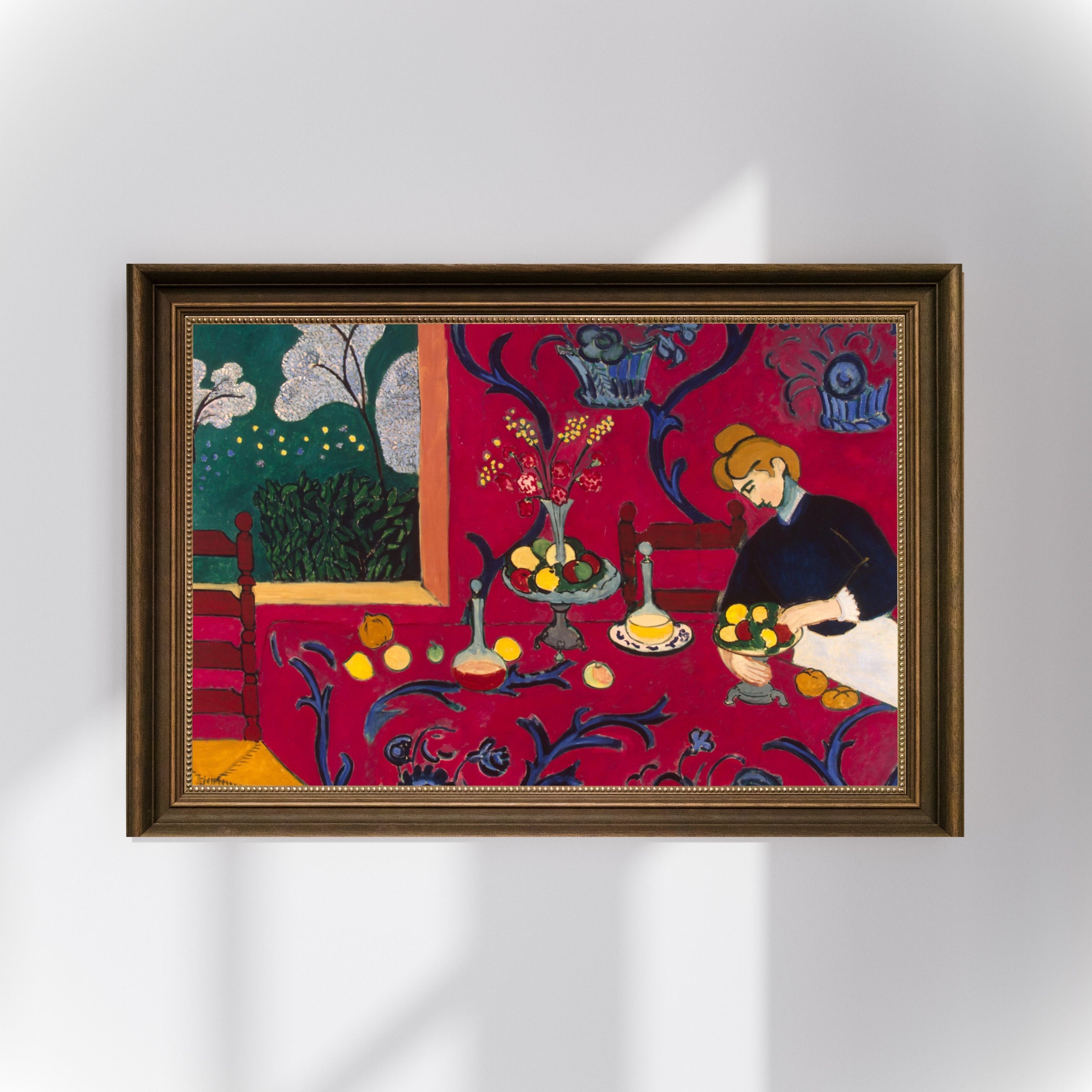 " Red Room (Harmony in Red) " was completed in 1908. In the work, a female figure arranges a table in front of a red-patterned tablecloth and a similarly patterned wall. Fruit, candlesticks, and a vase are placed on the table; however, these objects do not constitute a still life in the traditional sense. Matisse deliberately eliminates form and depth, transforming the space into a surface of color .