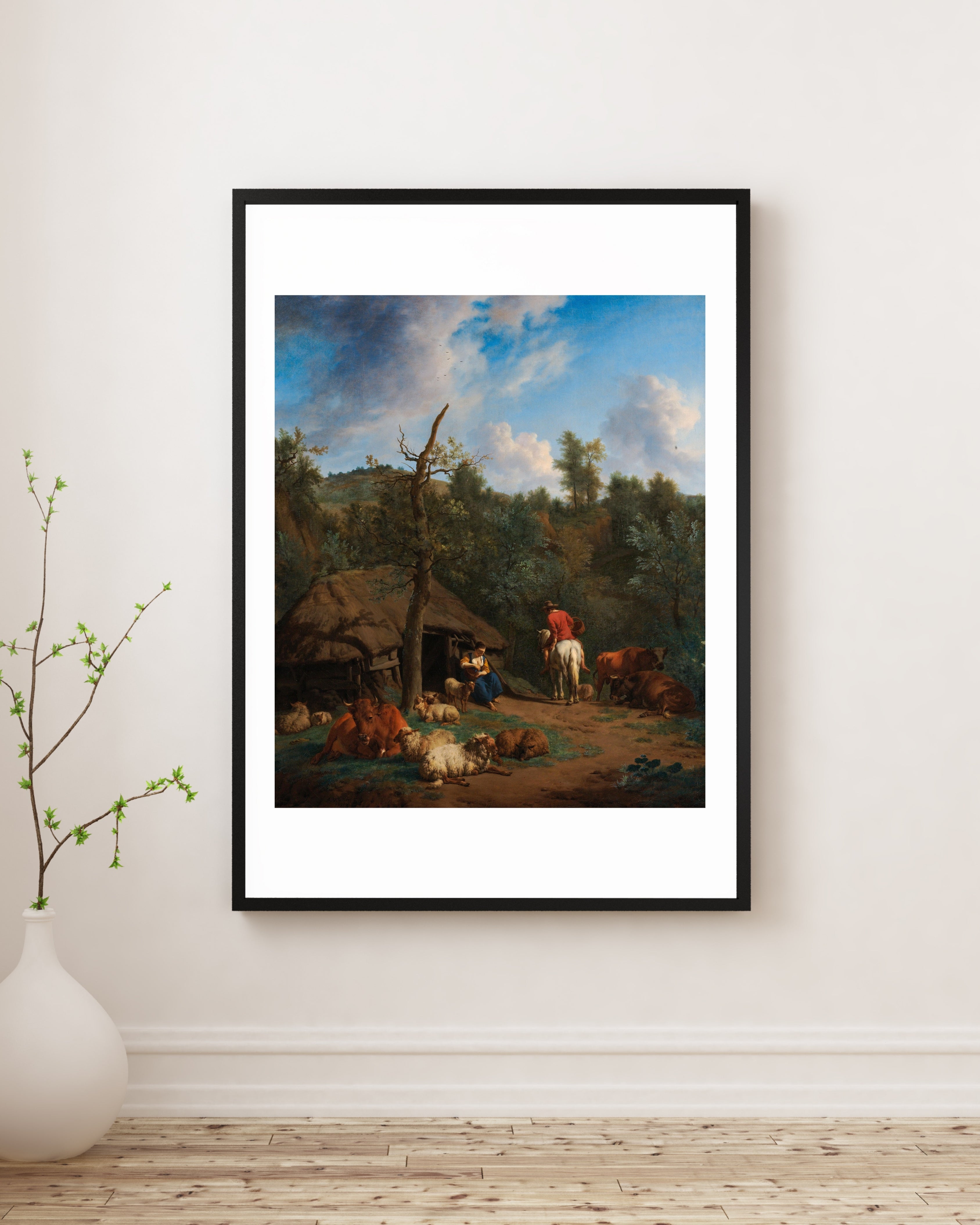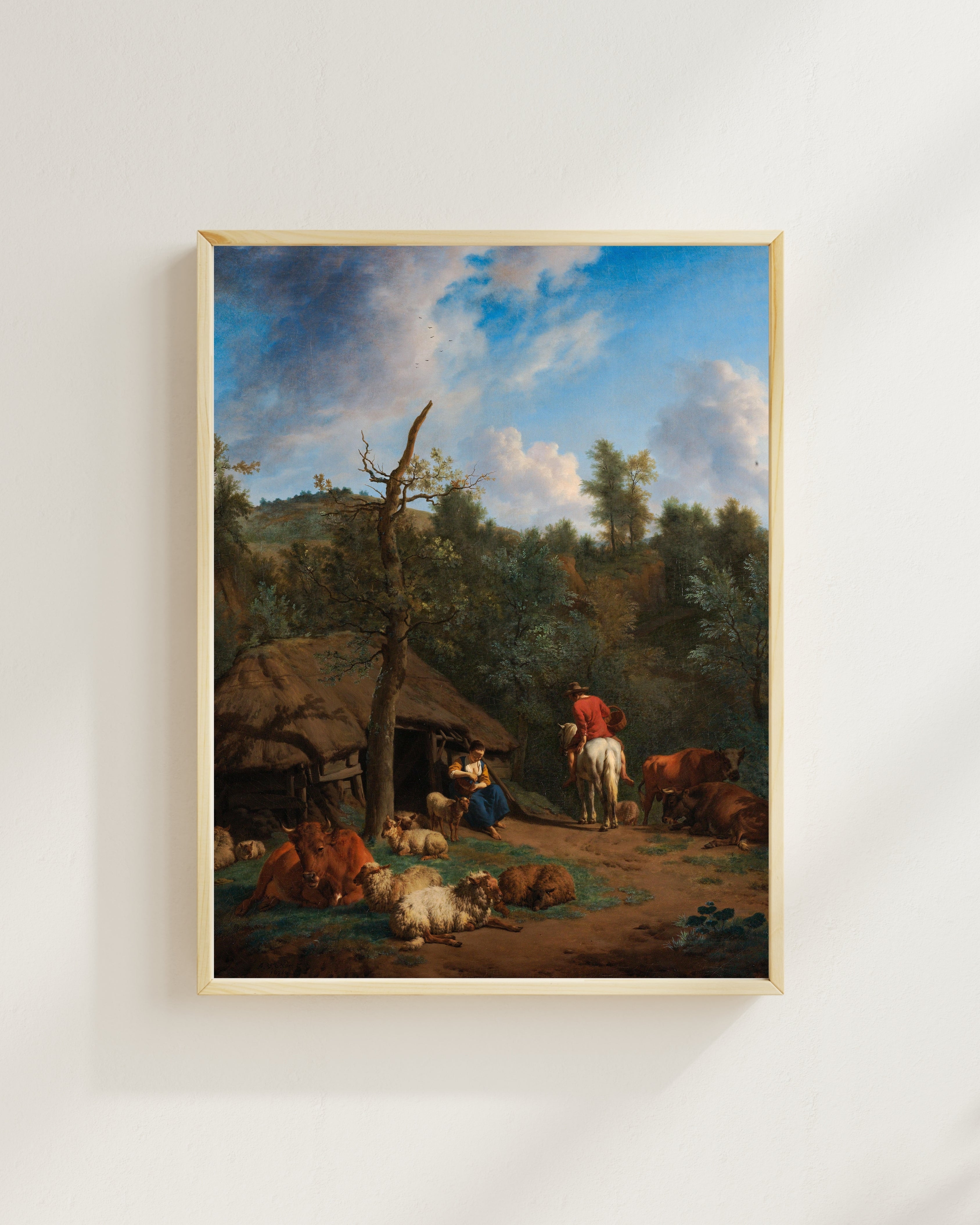 A simple stone hut sits at the center of the scene, with cows and a few figures resting in front of it. In the background, a vast sky and gently rolling hills in the distance add depth to the composition.